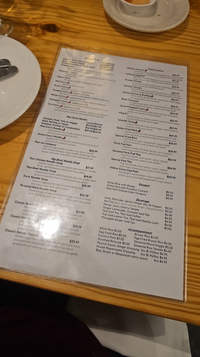 Many dishes are designed for sharing, making them well-suited for gatherings with friends or family. The inclusion of classics like Massaman Curry and Pad Kee Mao offers familiar favorites, while unique offerings such as Thai Curry Dumplings or Crispy Duck Noodle Soup bring a thoughtful twist to the traditional Thai experience.